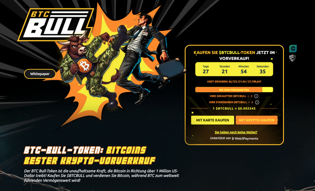 Heute befindet sich BTCBULL nämlich noch vor seinem ersten offiziellen Börsenlisting und kann ausschließlich über die Presale-Webseite und das dort befindliche Widget zum rabattierten Kurs von 0,0002545 $ gekauft werden. Bis heute kamen so bereits über 6,7 Millionen $ an Presale-Funding für BTCBULL zusammen. Der Vorverkauf wird dabei nur noch 27 Tage andauern.