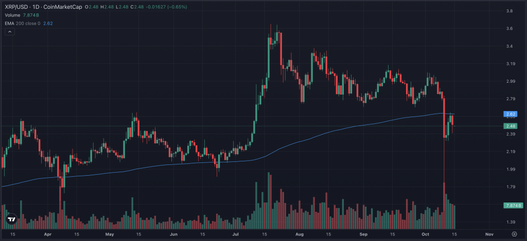 Zwar konnte sich XRP vom Tiefpunkt des Flash Crashs stark erholen, wie es bei den meisten Coins der Fall war, allerdings gibt es einige Anzeichen, die auf weiter fallende Kurse hindeuten. So wurde zum Beispiel die psychologisch wertvolle Marke von 2,50 Dollar unterschritten und der Versuch, diese nachhaltig zurückzuerobern, ist bis jetzt gescheitert.