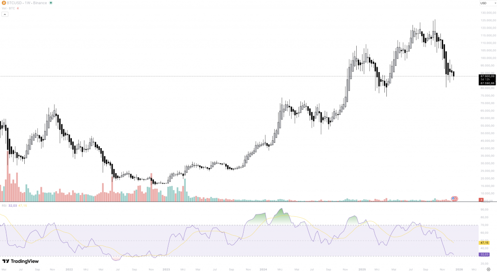 Bitcoin notiert zudem oberhalb des Tiefs aus dem März 2025. Spannend ist, dass der RSI zuletzt auf etwa 32 gefallen ist und damit den niedrigsten Stand seit Ende 2022 erreicht. Diese Konstellation nähert sich einem überverkauften Zustand und könnte aus antizyklischer Sicht wieder an Relevanz gewinnen.