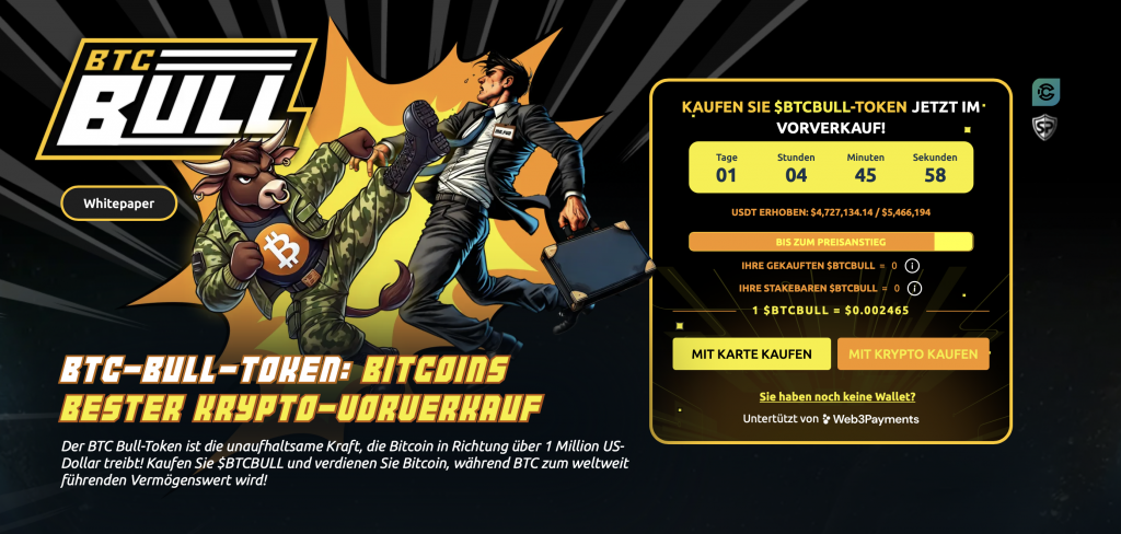 Durch diesen Ansatz ist $BTCBULL nicht wie die meisten Meme Coins konzipiert, die nach einer Kursexplosion meist schnell wieder zusammenbrechen, da Anleger hier eher langfristig orientiert sein dürften, um Bitcoin-Airdrops zu verdienen und von einer potenziellen Rallye zu profitieren. Derzeit ist $BTCBULL noch im Vorverkauf erhältlich, wobei bereits über 4,7 Millionen Dollar investiert wurden, was Analysten zu der Annahme führt, dass der Kurs nach dem Listing an den Börsen schnell um ein Vielfaches steigen könnte.