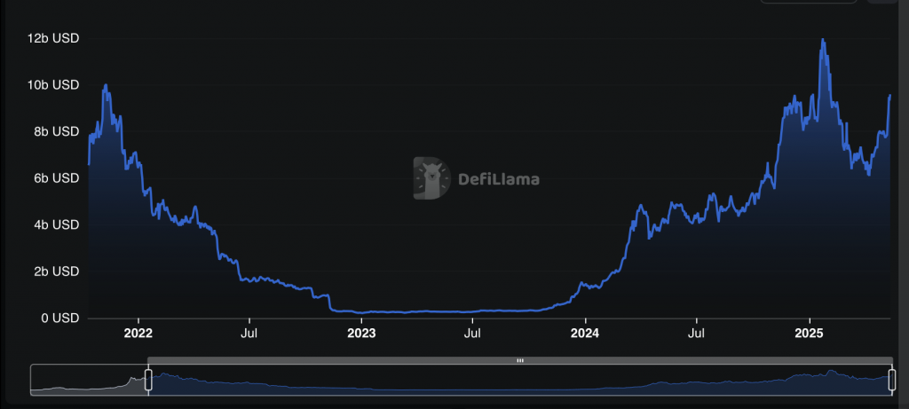 Im Mai 2025 nähert sich Solanas TVL dem bisherigen Allzeithoch – mit klar positiver Trenddynamik. Aktuell liegt das Total Value Locked bei rund 9,5 Milliarden US-Dollar – Tendenz steigend. Dieses fundamentale Wachstum würde einen weiteren Kursanstieg rechtfertigen.