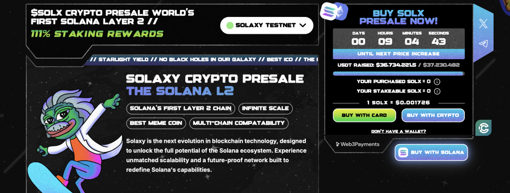Solaxy könnte dieses Problem mit einer eigenen Layer 2 lösen und erregt damit extrem viel Aufmerksamkeit. Der native Token $SOLX ist aktuell noch im Vorverkauf erhältlich und schon jetzt haben Anleger über 36,7 Millionen Dollar investiert. Das liegt wohl daran, dass man nicht oft die Gelegenheit bekommt, einen neuen Coin mit neuer Blockchain in einer so frühen Phase zu kaufen.