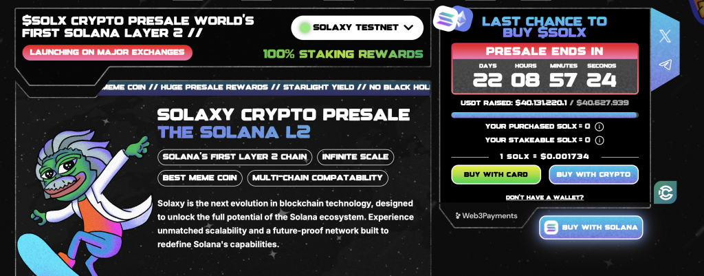 Im Zentrum der neuen Layer 2 steht $SOLX als nativer Token und dieser ist aktuell noch im Vorverkauf erhältlich. Das bedeutet, dass Anleger $SOLX noch zum günstigen Fixpreis kaufen können, bevor der neue Coin an den Börsen gelistet wird. Da man nicht oft die Gelegenheit bekommt, einen neuen Coin mit neuer Blockchain in einer so frühen Phase zu kaufen, explodiert die Nachfrage bereits. Anleger haben über 40 Millionen Dollar investiert, um von Anfang an dabei zu sein, weshalb vermutet wird, dass sich Solaxy schnell zu einem Milliarden Dollar Projekt entwickeln könnte.