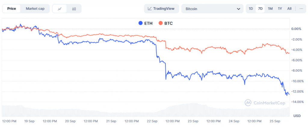 Ethereum Dip im Vegleich mit Bitcoin deutlich stärker, Quelle: www.coinmarketcap.com