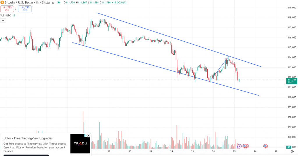 Bitcoin hat nach einem kurzen Bounce erneut an Kraft verloren. Zunächst konnte der Kurs nach einem Abverkauf in den Bereich um 111.350 US-Dollar zulegen, sogar ein Retest einer diagonalen Trendlinie brachte kurzfristig Aufwärtsmomentum. Doch der Anstieg scheiterte rasch, die Rückkehr unter die Linie signalisiert, dass die Erholung nicht nachhaltig war.