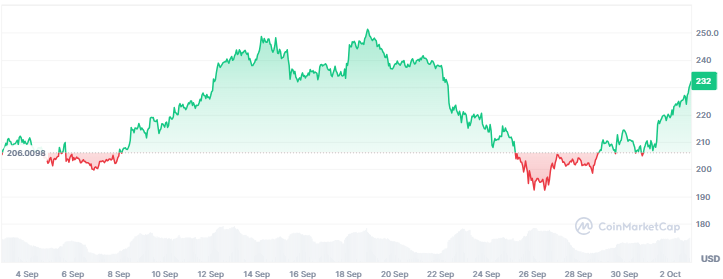 Blickt man auf die vergangene Tage, dann ist deutlich zu erkennen, dass es für Solana in Richtung Norden geht. In nur sieben Tagen legte der Altcoin um satte 17 Prozent zu, Tendenz steigend. Direkt daran knüpft eine positive Entwicklung von mehr als 11 Prozent in den vergangenen 30 Tagen an, die dazu führt, dass der Altcoin derzeit bei einem Kurs von über 225 US-Dollar steht. Die derzeitige Marktkapitalisierung liegt in diesem Zusammenhang bei rund 123 Milliarden US-Dollar, was Platz sechs am Kryptomarkt bedeutet.