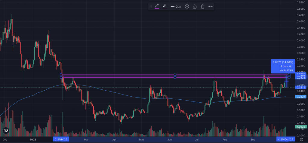 Aktuell notiert $DOGE bei 0,25 Dollar. Wie am Chart deutlich ersichtlich wird, hat sich im Bereich zwischen 0,28 bis 0,29 Dollar eine starke Widerstandszone gebildet, an der es in den letzten Monaten schon mehrmals zu einer starken Korrektur gekommen ist. Diese Widerstandszone liegt rund 15 % über dem aktuellen Kursniveau.