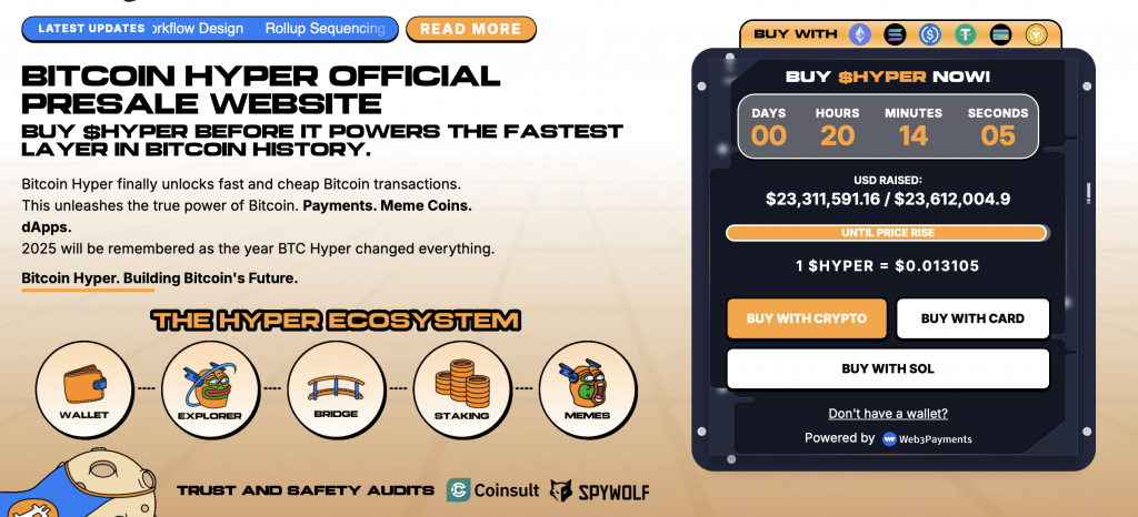 Der $HYPER-Token bildet das zentrale Element der neuen Layer-2-Blockchain und bietet Anlegern derzeit die Möglichkeit, frühzeitig einzusteigen. Noch ist der Coin ausschließlich im Vorverkauf erhältlich und wird bislang nicht an Börsen gehandelt. Dennoch ist das Interesse enorm. Bereits über 23,3 Millionen Dollar wurden in die Kryptowährung investiert. Experten rechnen damit, dass der Presale in Kürze ausverkauft sein dürfte. Mehrere Analysten sehen in Bitcoin Hyper sogar das Potenzial, langfristig eine Milliardenbewertung zu erreichen. Das würde bedeuten, dass es sich hier für Anleger um einen der besten Altcoins in diesem Jahr handeln wüde.