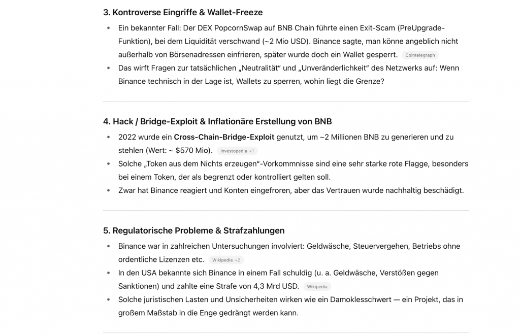 So weist die KI darauf hin, dass es in der Vergangenheit schon mehrere Fälle gegeben hat, die mit den Prinzipien der Krypto-Community nicht vereinbar sind. Von eingefroren Wallets, bei denen vorher behauptet wurde, dass man diese Möglichkeit nicht hat, bis hin zu einem Hack, bei dem zusätzliche BNB gemintet wurden, obwohl das eigentlich laut offiziellen Angaben nicht möglich sein sollte.
