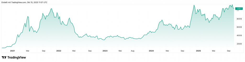 Wenn der Russell nun also über seine bisherigen Höchststände ausbricht, werden ETH und die meisten Altcoins höchstwahrscheinlich folgen. Erst heute hat der Russell wieder 1 % im Vergleich zum Nasdaq gewonnen und zeigt wachsendes Momentum. Gleichzeitig ist die Marktkapitalisierung gerade auf ein neues Allzeithoch ausgebrochen und hat die Höchststände von 2021 hinter sich gelassen.