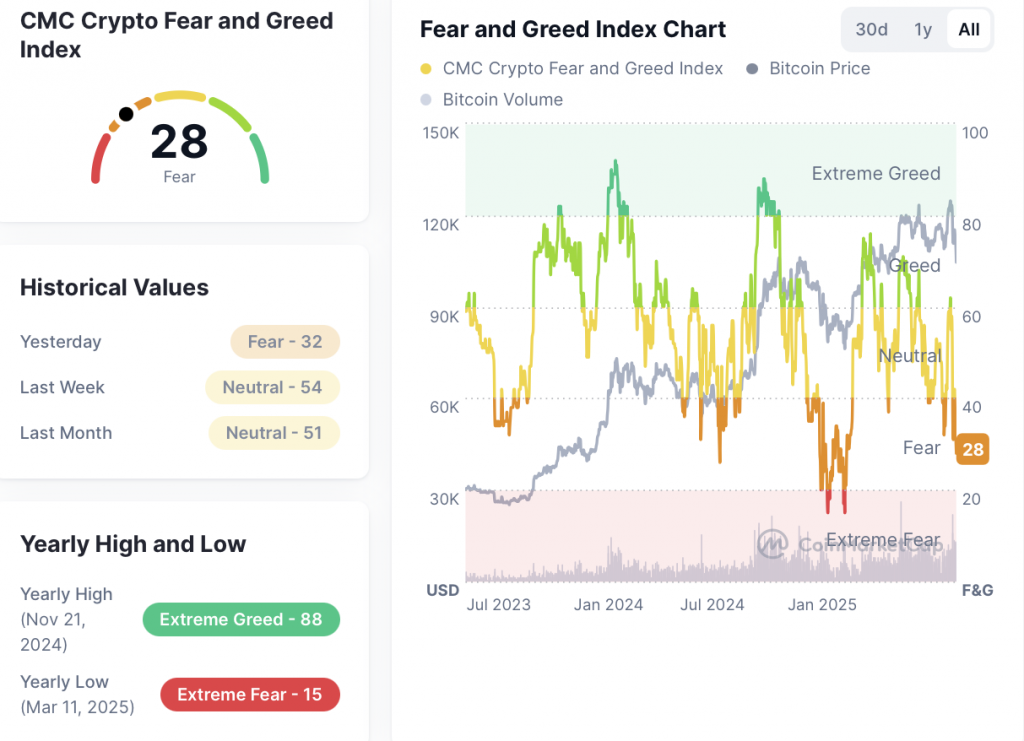 Der Kryptomarkt befindet sich aktuell in einer Phase zunehmender Unsicherheit. Der CMC Fear & Greed Index ist auf 28 Punkte gefallen und signalisiert damit klare „Fear“. Noch vor einer Woche lag die Stimmung mit einem Wert von 54 im neutralen Bereich, vor einem Monat bei 51. Die abrupte Verschlechterung zeigt, wie schnell sich das Sentiment eingetrübt hat. Steigende Volatilität und starke Kursrückgänge, vor allem bei Bitcoin, haben die Risikobereitschaft deutlich gedämpft. Der größte Krypto-Crash der Geschichte hat den Markt geschockt.