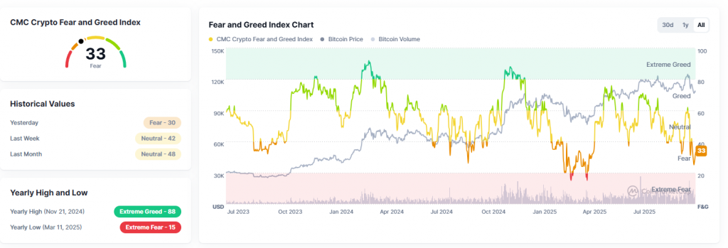 Fear an Greed Index in in Angst gefallen, Quelle: www.coinmarketcap.com