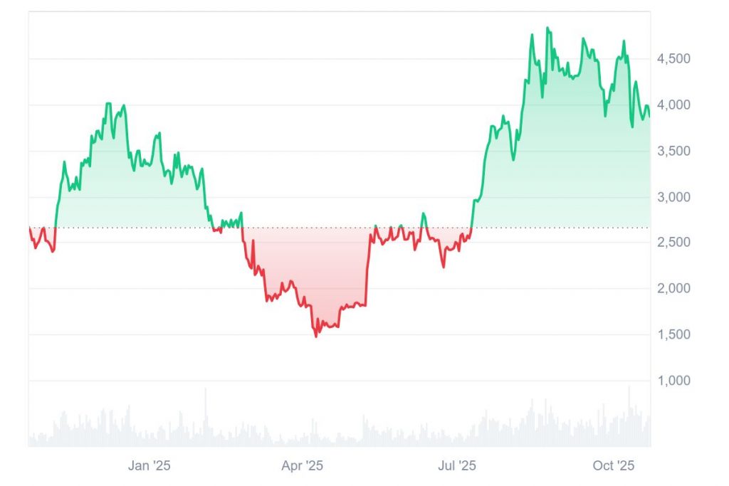Betrachtet man die Kursentwicklung von ETH im Verlauf der letzten Monate, so wird ein wenig positives Bild sichtbar. Zwar hatte es von April 2025 bis August 2025 eine massive Rallye gegeben, in deren Zuge der ETH-Kurs von unter 1.500 $ auf über 4.500 $ anstieg und am 24. August sogar ein neues All-Time-High bei 4.953 $ erreichte. Seitdem lässt der Kaufdruck jedoch nach, und ETH performt immer schwächer.