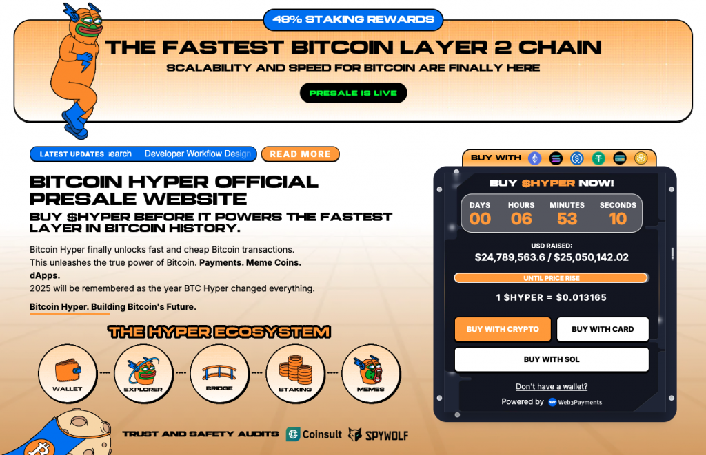 Kein Wunder also, dass es ein großes Interesse an der nativen Kryptowährung HYPER gibt. Bis jetzt flossen schon fast 25 Millionen $ in den Presale dieses Coins, und das, obwohl er sich noch vor dem ersten Börsenlisting befindet. Aufgrund dieser hohen Funding-Summe zählt der Bitcoin-Hyper-Presale schon jetzt zu den erfolgreichsten des Jahres. Aktuell kann HYPER noch zum rabattierten Kurs von 0,013165 $ gekauft werden. Allerdings ist nicht klar, wie lange der Presale noch läuft und wann der für den Vorverkauf vorgesehene HYPER-Supply ausverkauft sein wird.