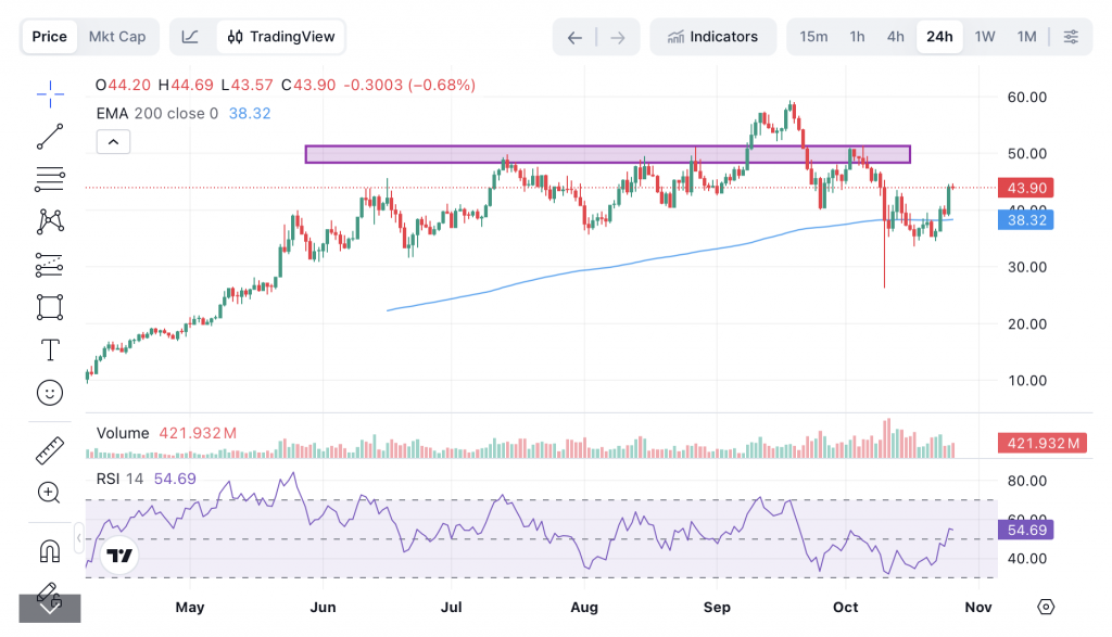 Im Bereich um 50 Dollar wurden die Bullen in der Vergangenheit allerdings mehrmals bearish abgewiesen, sodass es sich hier um einen harten Widerstand handelt. Das ist auch nicht verwunderlich, da die 50 Dollar Marke auch einen psychologisch wertvollen Effekt hat. Wer beim aktuellen Kurs einsteigt, hat also etwa 15 % Aufwärtspotenzial, bevor es kritisch wird. Wenn die 50 Dollar Marke überschritten wird, ist der Weg bis zum Allzeithoch allerdings frei, was ein Plus von rund 30 % bedeuten würde. Deutlich mehr Potenzial sehen Analysten derzeit allerdings im neuen Bitcoin Hyper ($HYPER).