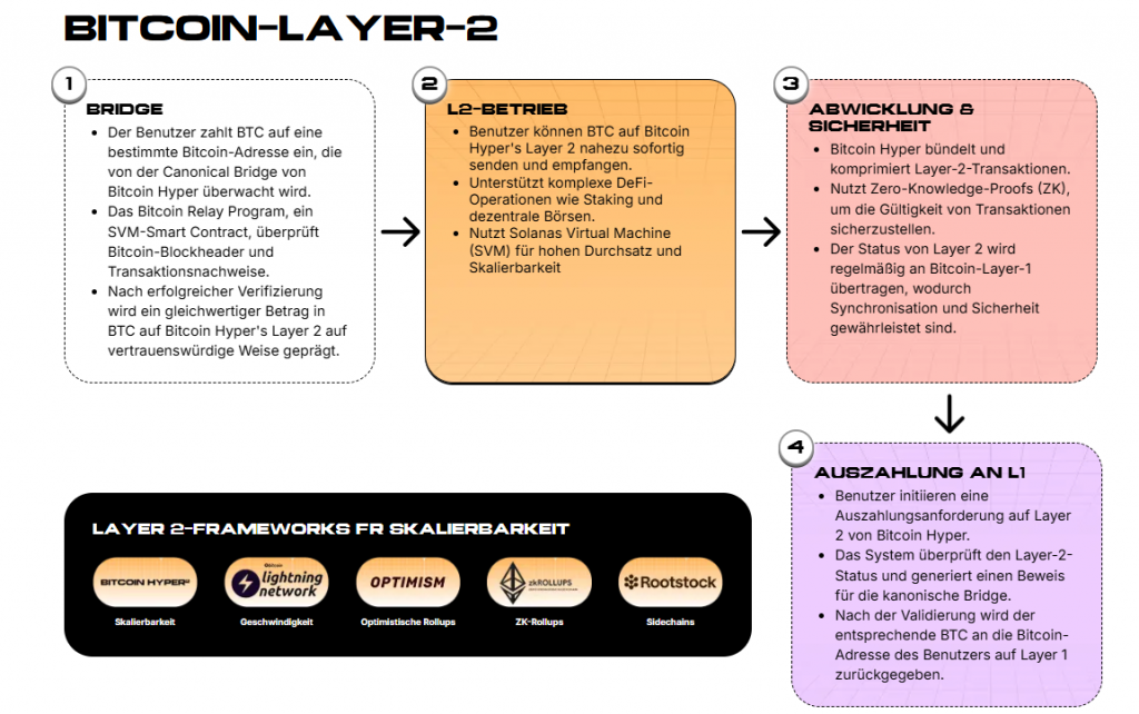 Doch hinter dem Hype steckt mehr als reine Spekulation. Bitcoin Hyper baut eine eigene Layer-2-Struktur auf, die das Bitcoin-Netzwerk skalierbarer und schneller machen soll. Herzstück ist eine Brücke, die BTC auf der Hauptchain sperrt und in Form eines Wrapped Tokens innerhalb des Hyper-Netzwerks nutzbar macht. Damit bleibt der Wert an Bitcoin gekoppelt, während Transaktionen deutlich schneller und günstiger ablaufen. Entwicklern steht eine modulare Architektur zur Verfügung, die mit Rust-basierten SDKs und bekannten Tools kompatibel ist – ähnlich wie bei Solana.