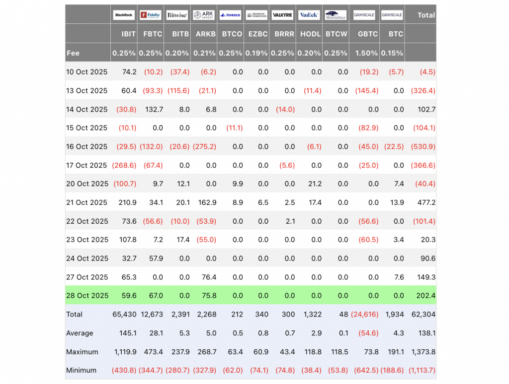 Zudem zeigt sich bereits, dass das institutionelle Interesse wieder zunimmt. Nachdem es in der ersten Oktoberhälfte noch zu erheblichen Abflüssen aus den Bitcoin-Spot-ETFs gekommen war, wenden sich viele institutionelle Investoren nun wieder Bitcoin zu. In den letzten 4 Handelstagen gab es erneut Nettozuflüsse in die Bitcoin-Spot-ETFs, wobei am 28. Oktober sogar ein Zufluss von über 200 Millionen $ verzeichnet wurde.