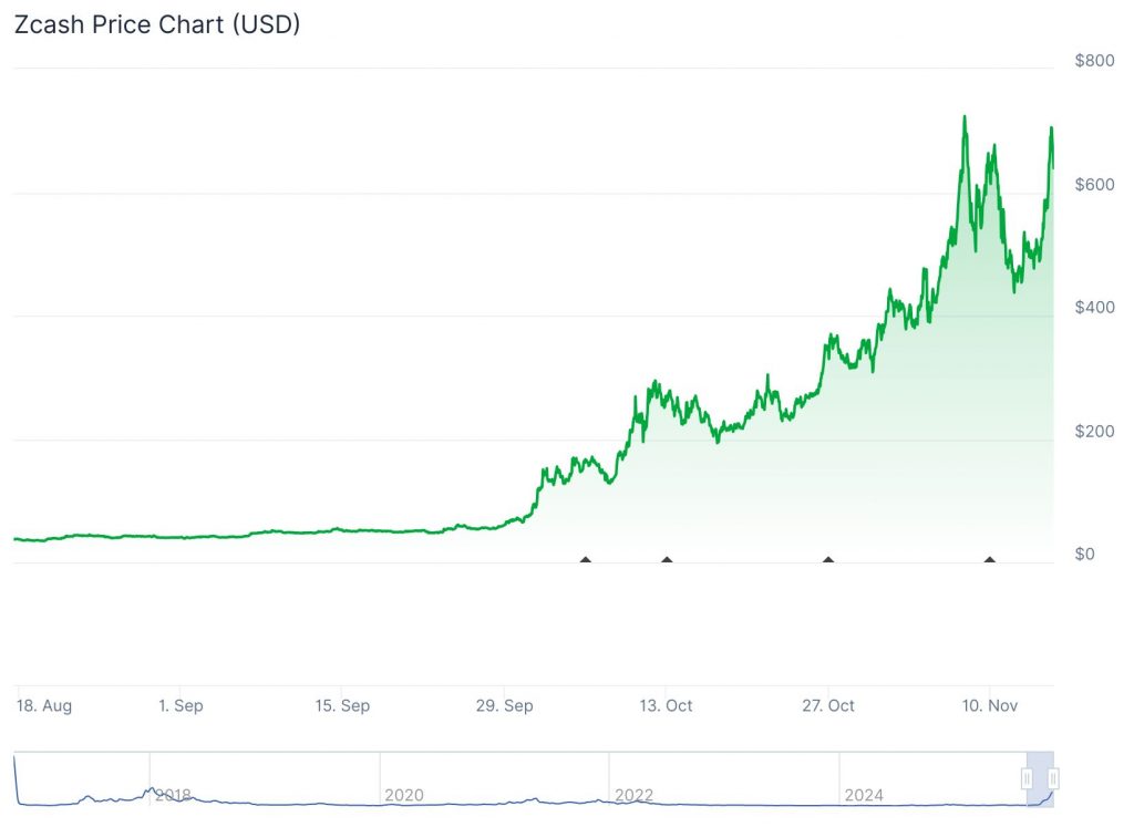 Interessanterweise gibt es jedoch schon heute zahlreiche Coins, die dem Marktaufschwung widerstehen und sogar starke Gewinne einfahren. Ein Beispiel für einen solchen Coin ist natürlich ZEC. Die Kryptowährung des auf Privacy fokussierten ZCash-Projektes verzeichnet ja schon seit Anfang Oktober eine historische Rallye. Seitdem konnte der Kurs von unter 50 $ auf aktuelle Höchststände von bis zu 700 $ steigen.
