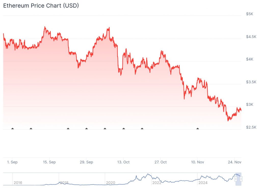 Ethereum hat in den letzten 3 Monaten eine regelrecht desaströse Kursentwicklung durchgemacht. Nachdem der Kurs noch Ende August auf knapp 5000 Dollar gestanden hatte, fiel er schnell wieder auf 4000 Dollar zurück. Anfang November wurde dann auch die 4000-Dollar-Marke nach unten hin durchbrochen und seitdem ist ETH sogar unter 3000 Dollar abgestürzt. Am 21. November hat sich so ein Tiefststand bei zwischenzeitlich nur noch 2630 Dollar gebildet.