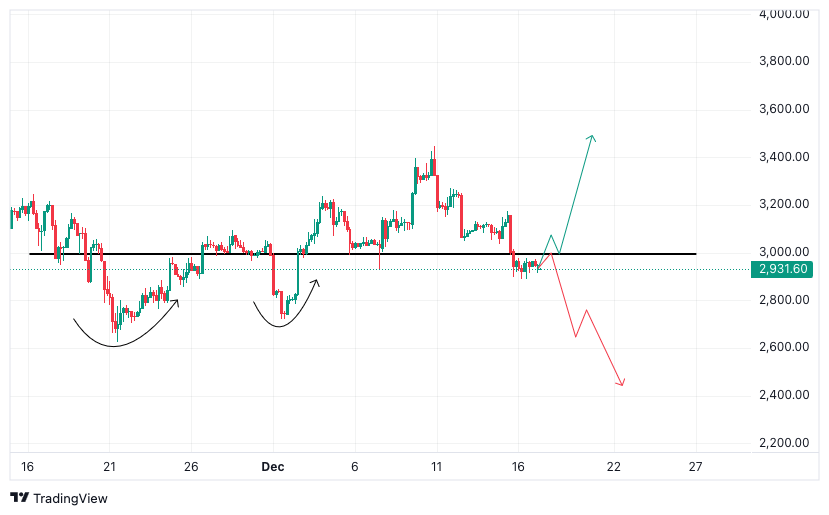 In einem bullischen Szenario müssten die Bullen nun den Support bei 2.900 oder zumindest bei 2.800 Dollar verteidigen, um von dort aus einen neuen Aufwärtsimpuls zu starten. Gelingt das, könnte sich ein weiteres Higher Low im Chart etablieren und ein potenzieller Trendwechsel nach dem Tief vom 21. November bestätigt werden.