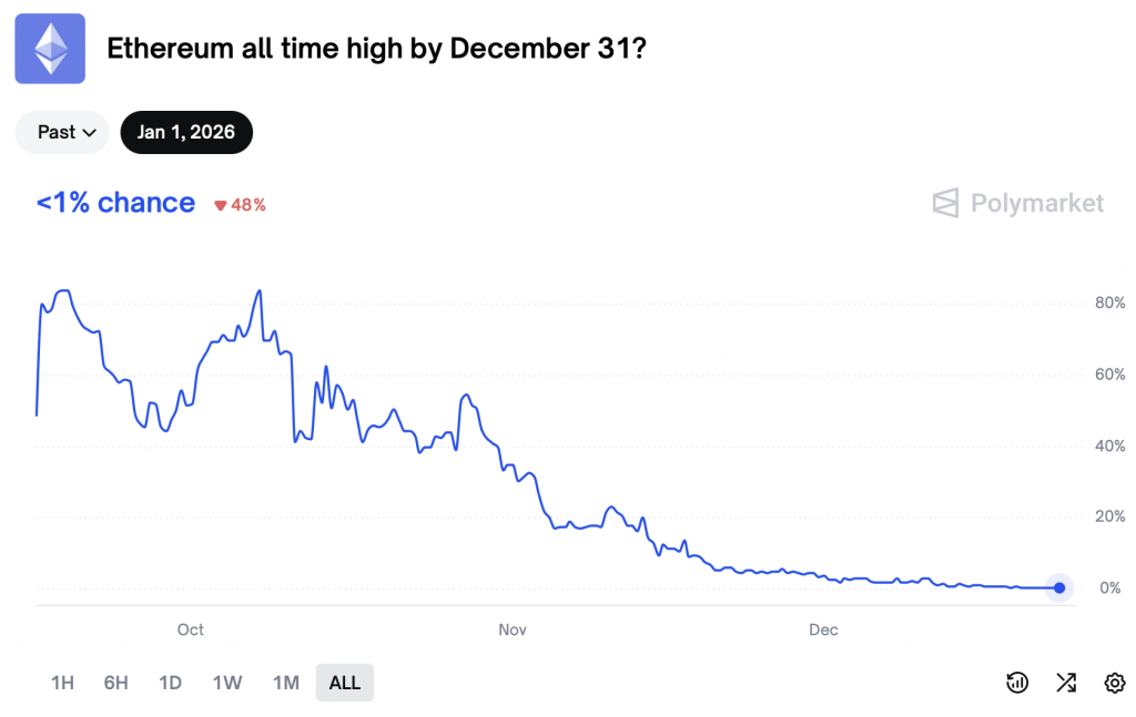 Spannend bleibt vor diesem Hintergrund die Frage nach einem neuen Rekordhoch. Ein neues Allzeithoch dürfte nach Einschätzung vieler Marktteilnehmer noch Zeit benötigen. Ein Blick auf Prognosemärkte unterstreicht diese Zurückhaltung. Laut Daten von Polymarket liegt die Wahrscheinlichkeit, dass Ethereum bis zum 31. Dezember 2025 ein neues Allzeithoch erreicht, aktuell bei unter einem Prozent.