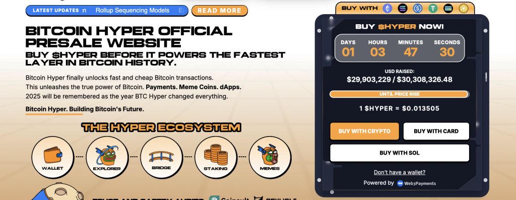 Der dazugehörige $HYPER-Token spielt dabei eine zentrale Rolle, ähnlich wie SOL im Solana-Netzwerk. Er wird für Gebühren, Staking, Liquidität und Anwendungen innerhalb der Hyper Chain benötigt. Aktuell befindet sich $HYPER noch im Vorverkauf, und bereits knapp 30 Millionen US-Dollar wurden investiert. Diese frühe Nachfrage deutet für viele Analysten darauf hin, dass der Token nach dem Börsenstart erhebliches Kurspotenzial haben könnte.