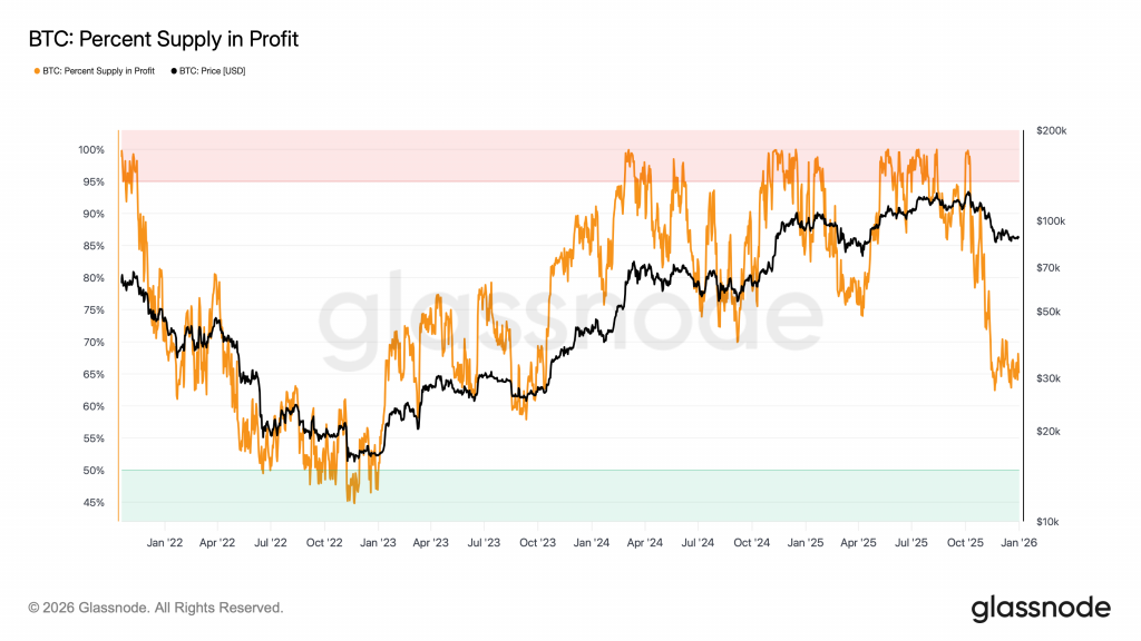 Die On-Chain-Metrik Bitcoin Percent Supply in Profit zeigt derweil, welcher Anteil des umlaufenden Bitcoin-Angebots aktuell über dem jeweiligen Einstandspreis liegt. Rund um das Allzeithoch im Oktober 2025 erreichte dieser Indikator Werte nahe 100 Prozent – praktisch jeder gehaltene Bitcoin lag damals im Gewinn. Historisch markieren solche Extremwerte häufig überhitzte Marktphasen. Entsprechend folgte im Anschluss eine deutliche Korrekturbewegung, die sich nicht nur im Kurs, sondern auch klar in dieser Kennzahl widerspiegelte.