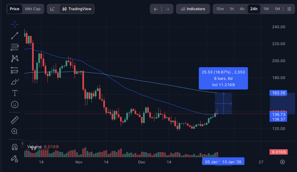 Entscheidend wird nun der Bereich um 145 US-Dollar. Hier hat sich in den vergangenen Wochen ein markanter Widerstand gebildet. Sollte Solana diesen Bereich nachhaltig überwinden, rückt der EMA200 bei rund 160 US-Dollar in den Fokus. Ein Bruch dieser Zone würde aus technischer Sicht vielen Marktbeobachtern zufolge den Weg für eine deutlich stärkere Bewegung freimachen. Allerdings ist dafür schon ein weiteres Plus von mehr als 18 % nötig.