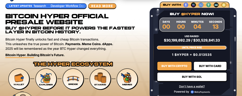Neben etablierten Altcoins wie Solana richten sich die Blicke vieler Investoren zunehmend auf neue Projekte mit höherem Wachstumspotenzial. Besonders häufig genannt wird aktuell Bitcoin Hyper ($HYPER). Das Projekt hat kürzlich die Marke von 30 Millionen US-Dollar im Vorverkauf überschritten, zu einem Zeitpunkt, an dem der Token noch nicht einmal an Börsen gelistet ist.
