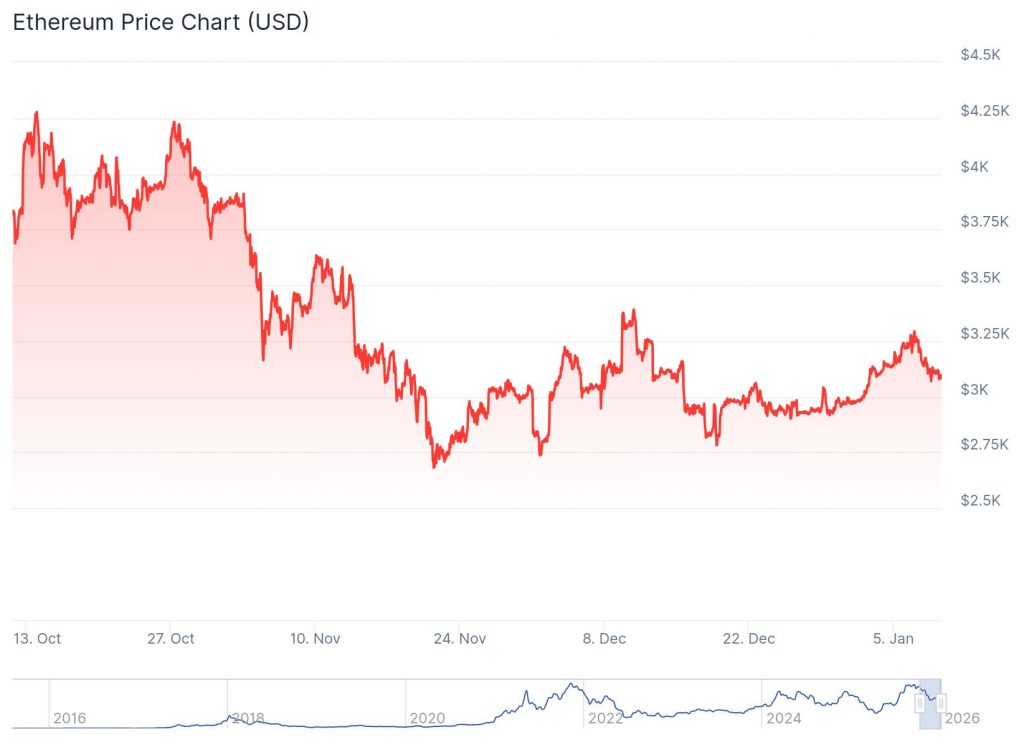 Doch die Charts zeigen ein gemischtes Bild. Technisch befindet sich Ethereum seit November in einem symmetrischen Dreieck, das durch tiefere Hochs und höhere Tiefs entsteht. Die Struktur deutet auf ein zunehmendes Kräftegleichgewicht zwischen Bullen und Bären hin. Der Kurs prallte bereits mehrfach am oberen Trendrand ab, so zuletzt am 7. Januar.