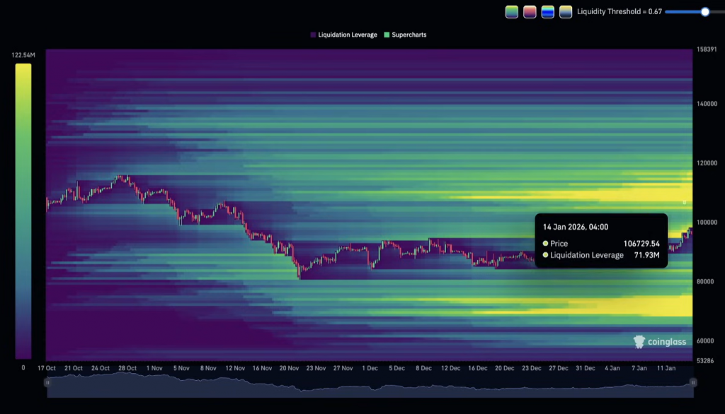 Ein Blick auf die Liquiditätskarte zeigt ein klares Bild. Oberhalb des aktuellen Kurses sammelt sich viel Liquidität zwischen 110.000 und 160.000 US-Dollar. Gleichzeitig liegt unterhalb des Marktes ein dichtes Cluster im Bereich von 68.000 bis 74.000 US-Dollar. Bitcoin bewegt sich traditionell in Richtung solcher Zonen.