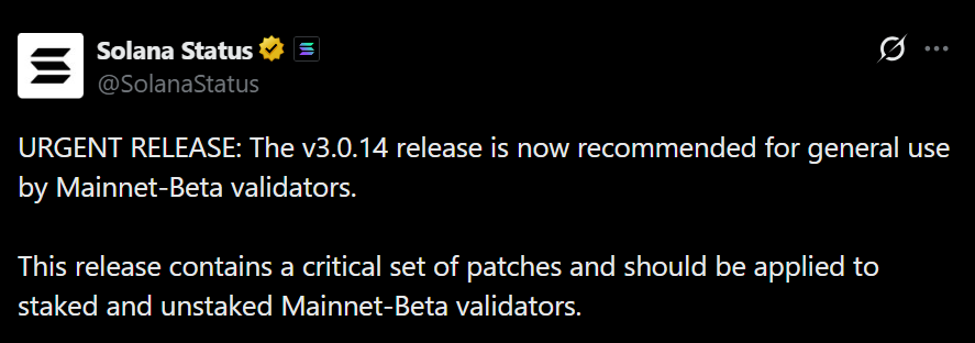 Solana hat das Update v3.0.14 veröffentlicht, das alle Mainnet-Beta-Validatoren auffordert, auf die neue Version umzusteigen. Diese Aktualisierung enthält wichtige Patches, die laut Projektteam die Netzwerkstabilität verbessern und potentielle technische Schwachstellen adressieren. Die Empfehlung zur sofortigen Installation verbreitete sich schnell über Validator-Kanäle und wurde tausendfach angesehen.
