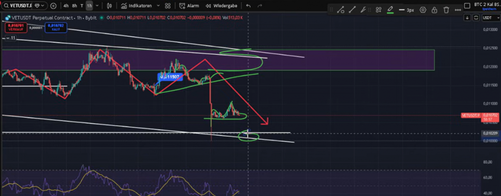 VeChain steht erneut vor einem kritischen Bereich. Der Support um 1,06 wird getestet. Fällt dieser, liegt der nächste Zielbereich zwischen 1,02 und 1,00. Dort befindet sich ein markanter Knotenpunkt, der zumindest temporär Halt geben könnte.