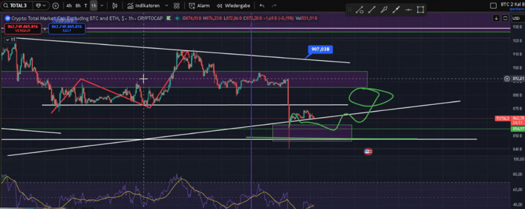 Der Altcoin-Markt kommt weiter nicht in Schwung. Die Total Crypto Market Cap 3 hält sich zwar über den letzten Tiefs, doch echte Kaufdynamik fehlt. Die Erholungen wirken zäh und verlaufen klar korrektiv. Technisch bleibt die eingezeichnete Diagonale der entscheidende Widerstand. Solange dieser Bereich nicht zurückerobert wird, bleibt das Risiko eines weiteren Rücksetzers bestehen. Relevant ist aktuell die Zone um 861,8 Punkte. Wird sie unterschritten, rückt der Bereich um 855 in den Fokus. Darunter liegt die nächste Auffangzone zwischen 850 und 847. Von einer Bodenbildung kann bislang keine Rede sein.
