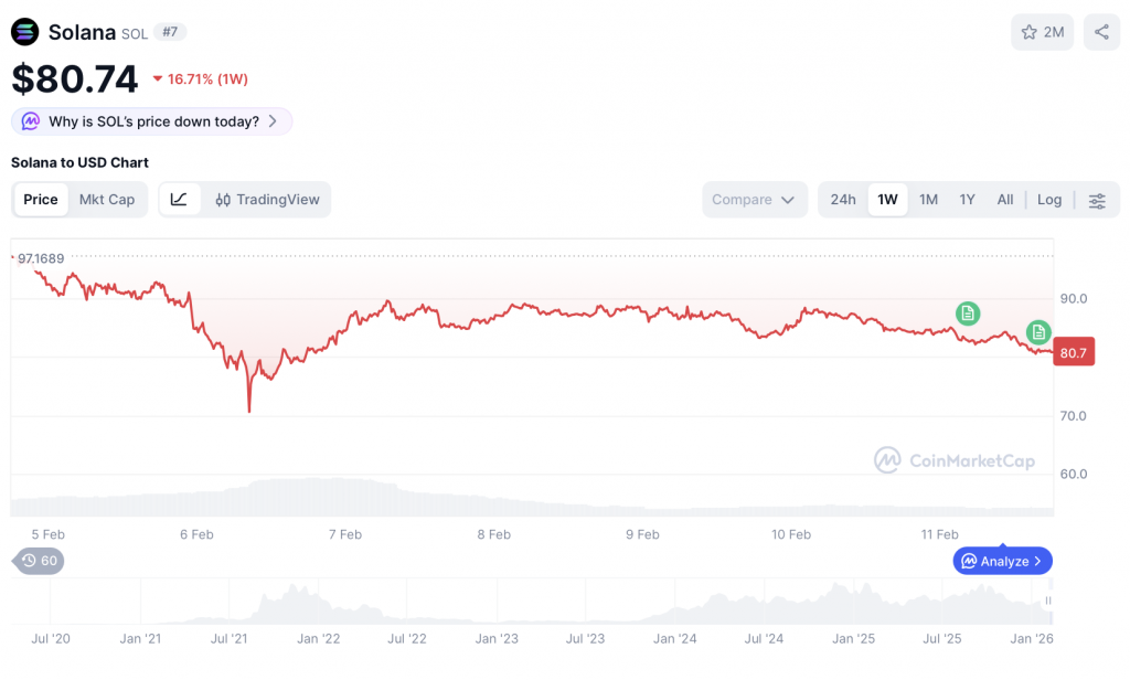 Bei Solana zeigt sich aktuell erneut Schwäche im Kursverlauf. Innerhalb der letzten rund 24 Stunden verlor der Token etwa fünf Prozent an Wert und testet damit wieder den Bereich um 80 US-Dollar. Auch auf Wochensicht bleiben die Verluste deutlich. Erst vergangene Woche war der Kurs zeitweise sogar bis in den Bereich um 70 US-Dollar gefallen. Die anschließende Erholung verliert inzwischen wieder an Dynamik. Entscheidend dürfte nun sein, ob kurzfristig neue Käufer auftreten oder Solana nachhaltig unter die Marke von 80 US-Dollar rutscht.