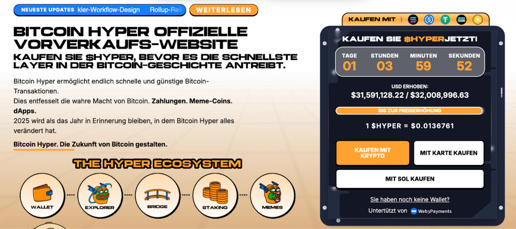 Kurzfristig bleibt das Umfeld jedoch anspruchsvoll. Geopolitische Unsicherheiten, weitere politische Entscheidungen in den USA sowie anstehende Quartalszahlen großer Technologieunternehmen können den Markt weiterhin belasten. Dennoch sehen viele Marktteilnehmer Solana gut positioniert, um bei einer allgemeinen Markterholung zu den relativen Gewinnern zu zählen. Parallel zur Diskussion um etablierte Layer-1-Blockchains wie Solana gewinnt mit Bitcoin Hyper ein Projekt an Aufmerksamkeit, das einen anderen Ansatz verfolgt. Bitcoin Hyper arbeitet an einer Layer-2-Lösung, die Bitcoin um moderne Funktionen erweitern soll, ohne dessen Sicherheitsmodell zu kompromittieren.