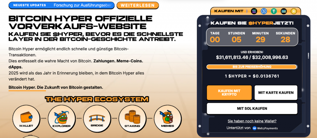 Das Interesse ist bereits jetzt beachtlich: Insgesamt wurden bereits über 31,6 Millionen US-Dollar in den Presale investiert. Marktbeobachter werten dies als starkes Signal für das Vertrauen der Community und spekulieren darauf, dass Bitcoin Hyper zu den aufmerksamkeitsstärkeren Launches der kommenden Monate zählen könnte. Für Anleger, die frühzeitig auf Infrastruktur-Projekte setzen möchten, die Bitcoin funktional erweitern, könnte Bitcoin Hyper damit eine interessante Ergänzung im aktuellen Marktumfeld darstellen.