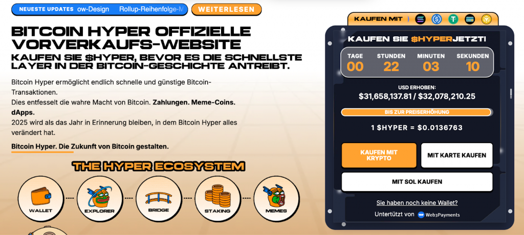 Der Hyper Token bildet das zentrale Element dieses Netzwerks. Er wird für Transaktionsgebühren eingesetzt, ermöglicht Staking und soll künftig Governance-Prozesse innerhalb der Plattform steuern. Derzeit befindet sich der Token noch im Presale. Nach Angaben des Projekts wurden bereits über 31,6 Millionen US-Dollar investiert. Investoren können aktuell zu einem festen Vorverkaufspreis einsteigen, bevor eine mögliche Börsennotierung erfolgt.