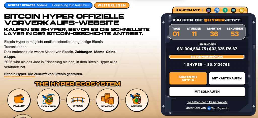 Das Projekt befindet sich aktuell noch im Presale und hat laut Angaben der Entwickler bereits über 31,9 Millionen US-Dollar eingesammelt. Investoren können damit frühzeitig am Aufbau eines neuen Bitcoin-Ökosystems teilnehmen. Das große Interesse am Presale verbunden mit den Bemühungen der US-Regierung, regulatorische Hürden zu reduzieren und Innovationen im Bereich neuer Technologien schneller voranzutreiben, deuten darauf hin, dass Bitcoin Hyper einer der interessantesten Altcoins 2026 werden könnte.