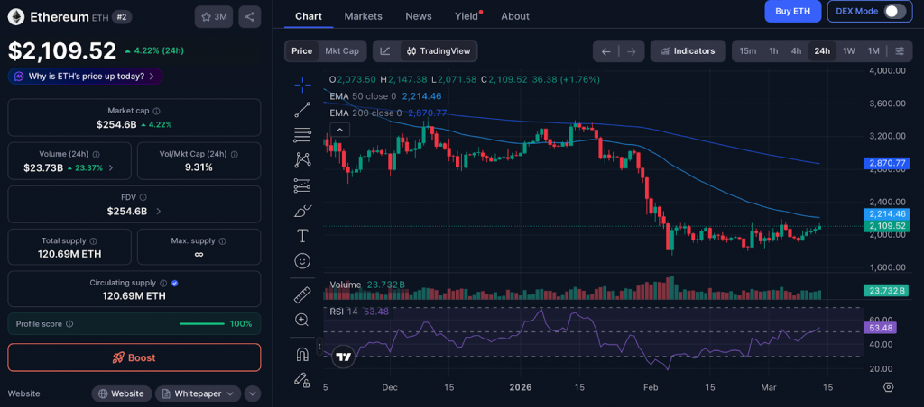 Gleichzeitig gibt es erste Zeichen einer Stabilisierung. Der RSI bewegt sich im Bereich von 53 und signalisiert damit weder eine Überhitzung noch eine ausgeprägte Schwäche. Nach dem starken Rücksetzer im Februar konnte sich ETH zuletzt oberhalb der Zone um 2.000 US Dollar etablieren. Für die kurzfristige Ethereum Prognose ist jetzt entscheidend, ob der Kurs die Region um die 50-Tage-Linie zurückerobern kann. Gelingt das, würde sich das Chartbild deutlich verbessern. Scheitert ETH dort erneut, dürfte die Seitwärtsphase zunächst anhalten.