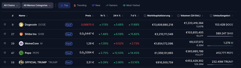 Im aktuellen Ranking fällt auch MemeCore auf. Der Coin bringt es auf eine Marktkapitalisierung von rund 1,65 Milliarden Euro und gehört damit zu den größeren Projekten im Meme-Sektor. Im Gegensatz zu Dogecoin oder Shiba Inu fehlt hier allerdings noch die langjährige Historie, weshalb der Coin für viele Anleger deutlich spekulativer wirkt.