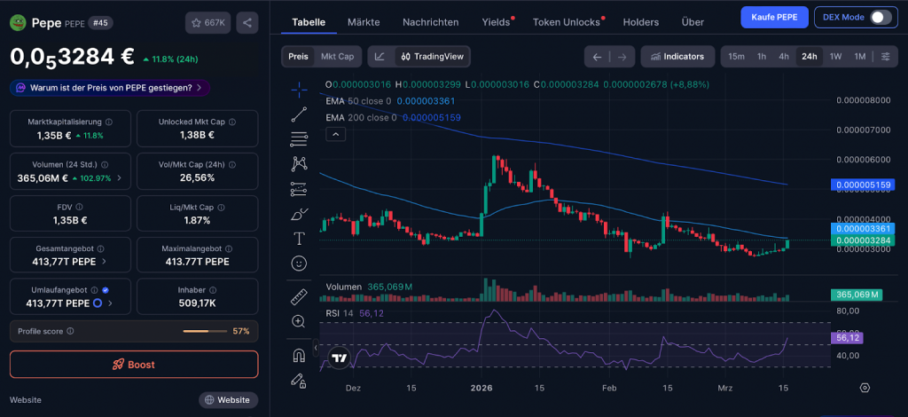 Pepe gehört inzwischen fest zur oberen Liga der Memecoins. Mit einer Marktkapitalisierung von rund 1,36 Milliarden Euro und einem Wochenplus von mehr als 15 Prozent zeigt der Coin weiterhin, dass er trotz seiner rein memegetriebenen Herkunft eine bemerkenswerte Marktpräsenz aufgebaut hat.