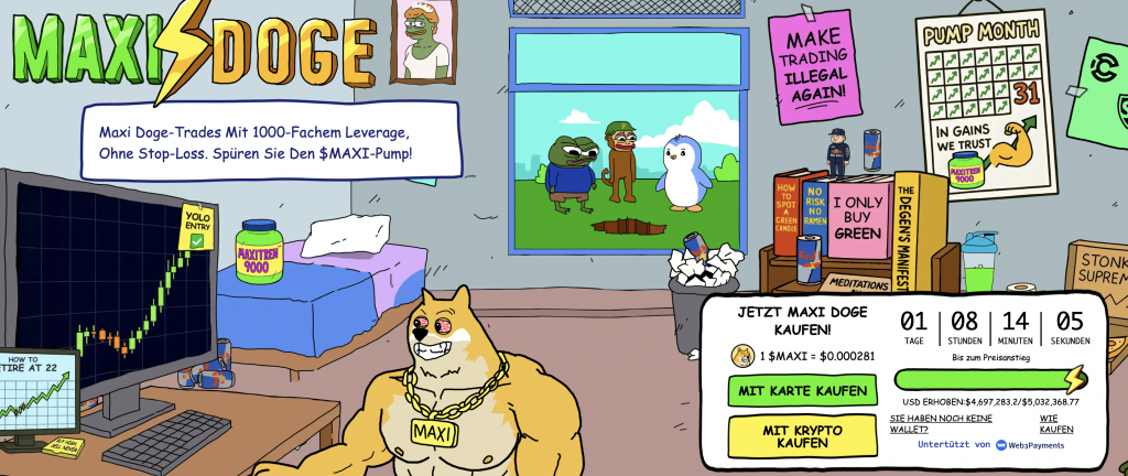 Neben solchen infrastrukturbasierten Projekten erleben auch klassische Meme Coins aktuell wieder verstärkt Aufmerksamkeit. Ein Beispiel dafür ist Maxi Doge mit dem Token $MAXI. Das Projekt basiert auf der Ethereum-Blockchain und setzt gezielt auf Community-Effekte, virale Verbreitung und Social-Media-Dynamik.