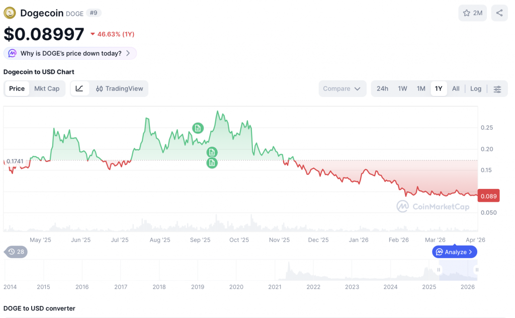 Der Kryptomarkt zeigt sich heute erneut schwächer und steht unter spürbarem Verkaufsdruck. Besonders riskante Assets wie Memecoins geraten in solchen Phasen schnell unter die Räder – allen voran Dogecoin. Die Spaßwährung notiert aktuell mehr als 80 Prozent unter ihrem Allzeithoch und hat allein in den letzten zwölf Monaten rund die Hälfte ihres Werts eingebüßt.