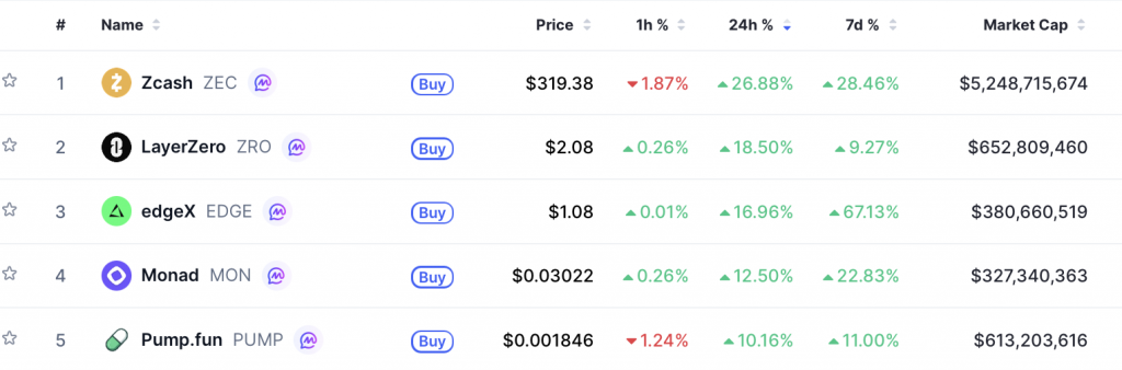Noch beeindruckender ist jedoch die Dynamik bei ausgewählten Altcoins. Laut aktuellen Daten gehört Zcash (ZEC) zu den stärksten Performern im gesamten Top-100-Ranking auf CoinMarketCap. Mit einem Tagesplus von über 26 Prozent und einer Wochenperformance von rund 28 Prozent führt ZEC das Feld an. Diese klare relative Stärke deutet darauf hin, dass Kapital gezielt in einzelne Narrative fließt.