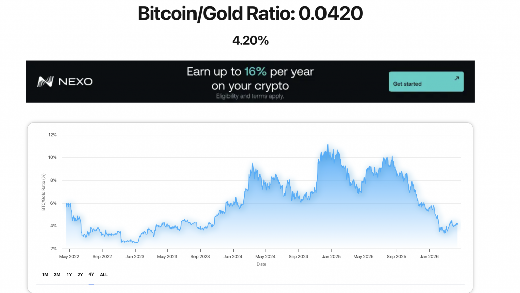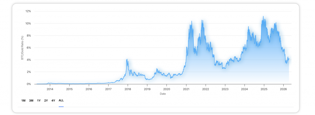 Die Bitcoin-Gold-Ratio beschreibt, wie stark sich Bitcoin im Vergleich zu Gold entwickelt. Aktuell liegt diese Kennzahl bei rund 4,2 % und damit auf einem Niveau, das zuletzt Anfang 2023 erreicht wurde. Historisch betrachtet markierten solche Phasen häufig attraktive Einstiegszonen für langfristige Investoren.
