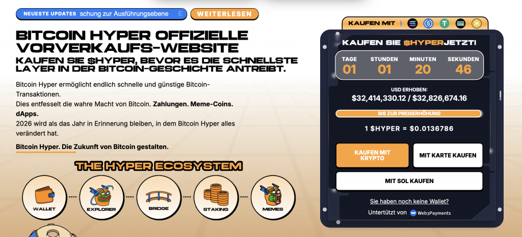 Der $HYPER-Token spielt dabei eine zentrale Rolle innerhalb des Ökosystems und wird aktuell im Presale angeboten. Aufgrund der wachsenden Aufmerksamkeit rund um Bitcoin Layer-2-Lösungen sehen viele Marktteilnehmer in Bitcoin Hyper einen der spannendsten Kandidaten für die kommende Marktphase.