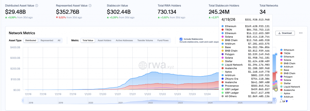 Auch die Nutzerbasis wächst kontinuierlich. Über 730.000 Wallets halten inzwischen tokenisierte Vermögenswerte, während die Zahl der Stablecoin-Nutzer bei über 245 Millionen liegt. Parallel dazu steigt die Anzahl unterstützter Netzwerke, aktuell sind es mehr als 30 Blockchains. Dennoch konzentrieren sich die Kapitalflüsse stark auf wenige dominante Chains.