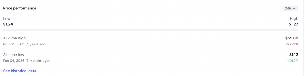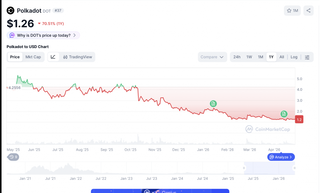 Die Entwicklung von Polkadot zeigt sich weiterhin schwach. Mit einem aktuellen Kurs von rund 1,26 US-Dollar notiert $DOT deutlich unter seinem Allzeithoch von 55 US-Dollar aus dem Jahr 2021 – ein Rückgang von über 97 Prozent.